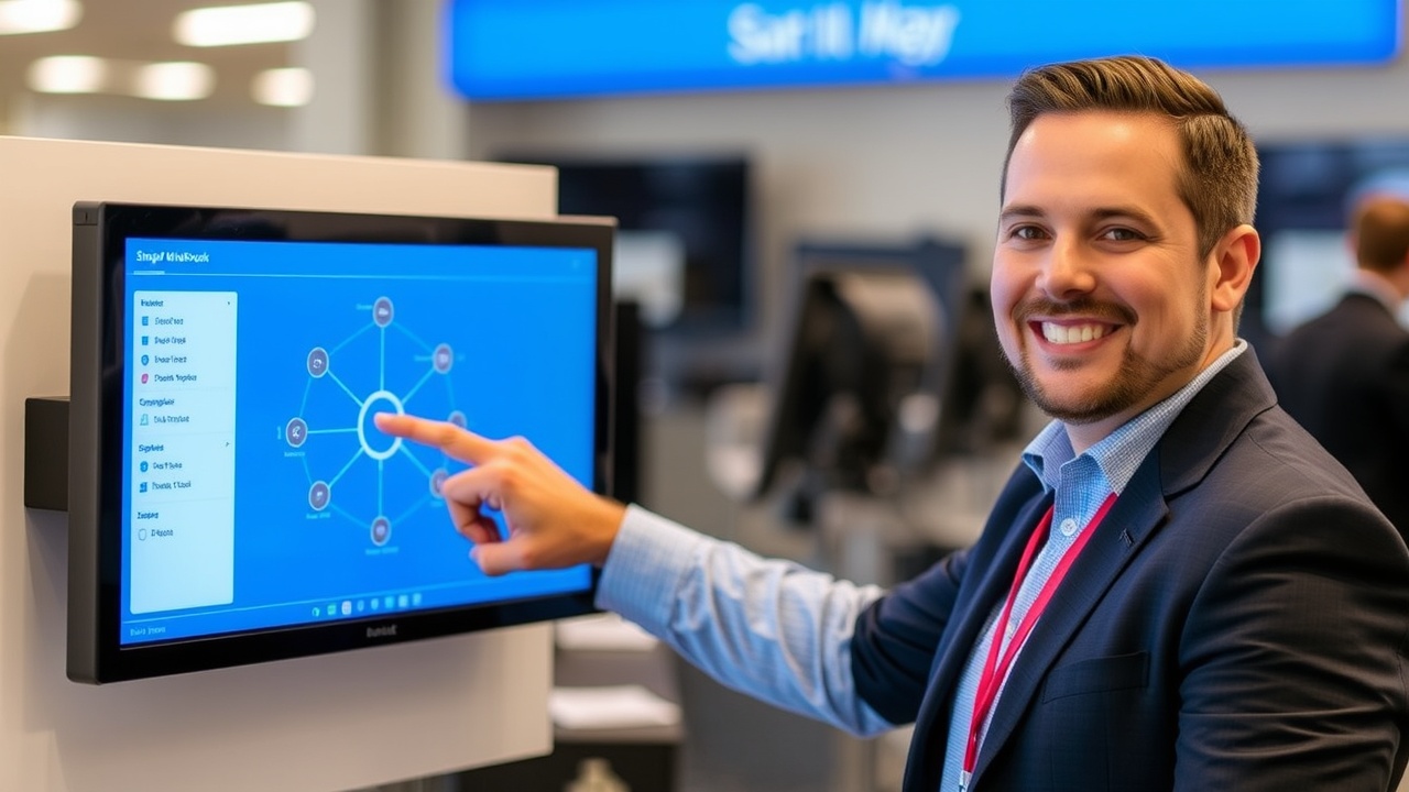 A smiling salesperson points at a digital screen with a simple network map.